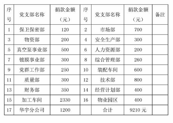 公司17個黨支部共捐款合計9210元(玖仟貳佰壹拾元整),黨群工作部已將全部捐款上繳。各支部捐款明細(xì)如下: