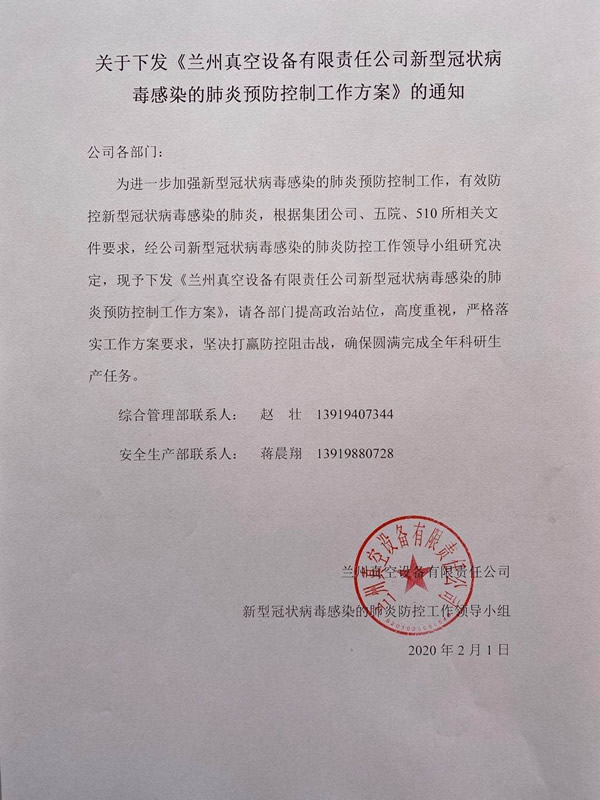 接到新型冠狀病毒感染的肺炎疫情防控工作要求的第一時(shí)間,他們便趕到公司,制定下發(fā)了公司《關(guān)于進(jìn)一步加強(qiáng)新型冠狀病毒感染的肺炎預(yù)防控制工作的緊急通知》,成立了公司“新型冠狀病毒感染的肺炎防控工作領(lǐng)導(dǎo)小組”,擔(dān)負(fù)起了防控小組的主要日常工作,為保障假日期間信息渠道通暢,兩個(gè)人的手機(jī)24小時(shí)保持開機(jī)暢通狀態(tài),隨時(shí)處理各方面的信息,除了認(rèn)真收集、匯總信息外,兩位同志還在2月1日制定下發(fā)了《蘭州真空新型冠狀病毒感染的肺炎預(yù)防控制工作方案》,為公司疫情防控工作提供了制度保障。